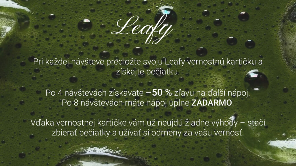 Menu To Drink CLASSIC HOT MATCHA LATTETradičné matcha latte, jemné a krémové. 4,00 € BIELA ČOKOLÁDAMATCHA LATTEKrémová, sladká a hladká.4,50 € PUMPKIN SPICEMATCHA LATTEJesenné korenie a tekvicová chuť.4,50 € CLASSIC ICED MATCHA LATTEOsviežujúce a krémové.5,00 € JAHODA ICED MATCHA LATTEJahodové a krémové.5,00 € To Eat WHITE CHOCOLATE MATCHA TARTKrehký tart s bielou čokoládou a matcha krémom.4,50 € MATCHA COOKIESDomáce sušienky s matcha práškom, jemne sladké a chrumkavé.3,50 € RASPBERRY BROWNIESMalinové brownie pre osvieženie. 4,50 € BLUEBERRY MUFFINČučoriedkový muffín, vlhký a sladký.4,50 € MINI MATCHA ROLLMalý roládový dezert s matcha a krémom.3,50 € Objednávajte výhodnejšie s našou vernostnou kartičkou!